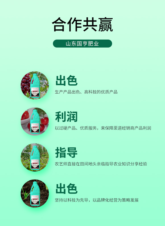 公司緊隨市場變化,關注肥料高新科技的發(fā)展趨勢,在國內市場銷售的同時,也積極出口國外貿易。公司現(xiàn)有“國亨”“ 田園壯”兩大品牌,依托強勢的服務和強大的品牌理念,公司在不斷發(fā)展壯大。一直以來,公司總是處于時代的前列,超前發(fā)展的思想,始終占領市場競爭的至高點。