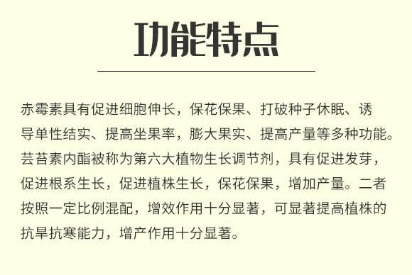 赤霉素具有促進細胞伸長,;ū9、打破種子休眠、誘導(dǎo)單性結(jié)實、提高坐果率,膨大果實、提高產(chǎn)量等多種功能。蕓苔素內(nèi)酯被稱為第六大植物生長調(diào)節(jié)劑,具有促進發(fā)芽,促進根系生長,促進植株生長,保花保果,增加產(chǎn)量。二者按照一定比例混配,增效作用十分顯著,可顯著提高植株的抗旱抗寒能力,增產(chǎn)作用十分顯著。
