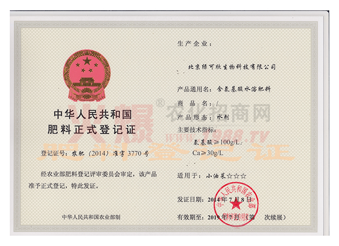 北京綠可欣生物科技有限公司成立于2007年,我們的核心技術(shù)是將進口的高純醫(yī)藥級海藻精原粉,與氨基酸、黃腐酸、和大、中、微量元素螯合在一起,使產(chǎn)品不但可以“激發(fā)作物的生命潛能”,“提高作物的抗逆性”,“增加作物的產(chǎn)量”,同時可以限度的平衡“營養(yǎng)生長”和“生殖生長”,在國內(nèi)尚屬首創(chuàng)。